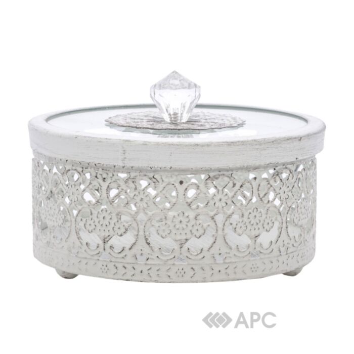 Скринька металева Art-Pol — це свого роду органайзер, що призначений для зберігання різноманітних прикрас, аксесуарів, косметичних засобів та інших дрібних речей. Володіє стильним, оригінальним дизайном. Має круглу форму та кришку з кришталевою ручкою. Стінки прикрашені квітковими мотивами, тому виріб створює хороший настрій, а також дарує лише приємні емоції. Зроблена з металу у білому кольорі, підходить практично до будь-якого дизайну інтер’єру. Стане відмінним подарунком для будь-якої жінки. Розміри товару 8*12*12 см.