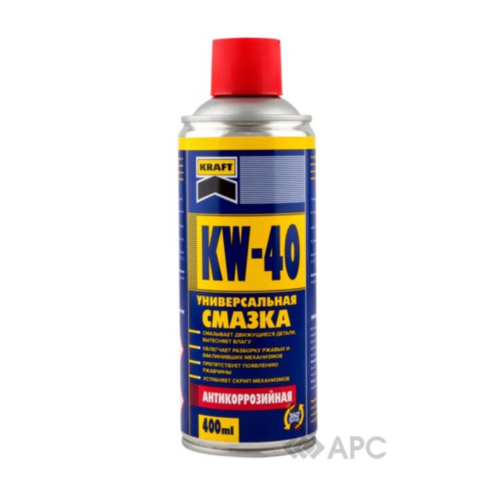 Спрей універсальний Kraft KW-40 400 мл — багатоцільове мастило для комплексного обслуговування різних вузлів та механізмів. Засіб одночасно очищає, змащує та захищає поверхню від корозії, а також повертає рухливість тим різьбовим з'єднанням, які суттєво поржавіли. Завдяки такій обробці полегшується монтаж та демонтаж, зменшується тертя та знос деталей. Використання спрею дозволяє витіснити вологу, усуває скрип. Перед застосуванням балончик рекомендується добре збовтати, після чого рівномірно нанести засіб на поверхню. Після повного висихання складу рекомендується акуратно видалити його залишки.
