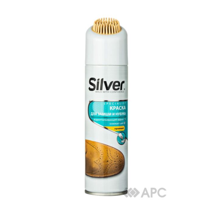 Спрей-фарба відновник Silver — це універсальний засіб, який підходить для відновлення стану нубукових чи замшевих виробів. Продукція швидко та ефективно повертає взуттю привабливий вигляд, оскільки рівномірно забарвлює матеріал у гірчичний колір, добре приховує потертості. Використовувати лише для виробів кольору кемел або гірчичних. Захисна водовідштовхувальна плівка - захищає від вологи та інших негативних впливів. Перед використанням потрібно очистити поверхню взуття щіткою, що знаходиться на кришці, тоді струсити засіб і на відстані 15-20 см розпорошити фарбу.