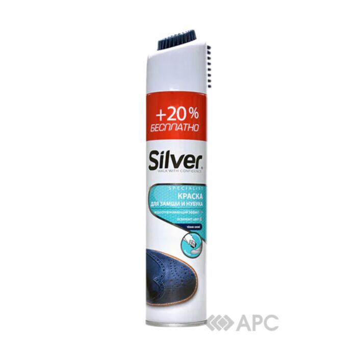 Спрей-фарба відновник Silver — це універсальний засіб, який підходить для відновлення стану нубукових чи замшевих виробів. Продукція швидко та ефективно повертає взуттю привабливий вигляд, оскільки рівномірно забарвлює матеріал у темно-синій колір, добре приховує потертості. Використовувати лише для виробів синього кольору. Захисна водовідштовхувальна плівка - захищає від вологи та інших негативних впливів. Перед використанням потрібно очистити поверхню взуття щіткою, що знаходиться на кришці, тоді струсити засіб і на відстані 15-20 см розпорошити фарбу.