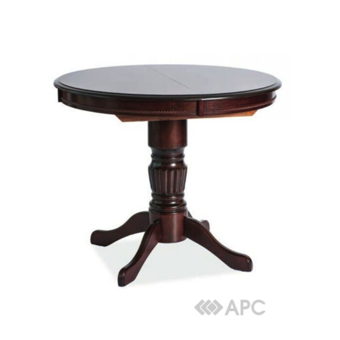 Форма стільниці кругла, вона виготовлена з МДФ високої якості, покритого натуральним шпоном. Каркас виготовлений з деревини, кольору темний горіх.