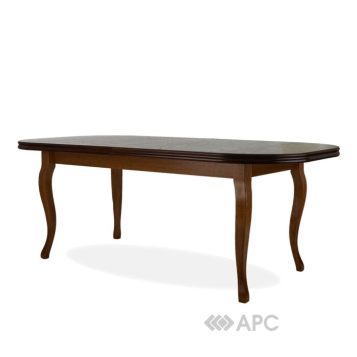 На благо зовнішньої досконалості служать матеріали. Каркас столу з його опорами виготовляється з натуральної деревини з характерним текстурованим малюнком, що наповнює кімнату домашнім теплом і затишком. Стільниця виготовляється з МДФ з імітацією деревної текстури і навмисно забарвлюється в темніший колір, на контрасті підкреслюючи особливості стилізованої опори. Приємним доповненням цього цікавого столу є розкладний механізм, здатний збільшити довжину стільниці до 280 см, що гарантує зручну посадку дванадцяти гостей!