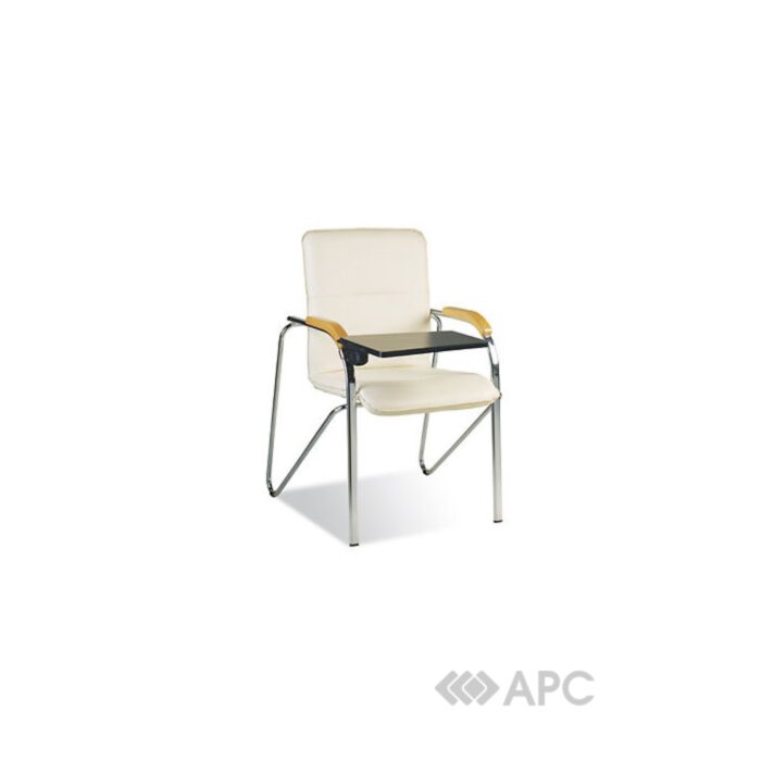 Стілець з комфортними сидінням і спинкою може бути виконаний в натуральній шкірі Lux і Split, штучній шкірі, тканинах Cagliari, Pieva, Microsolco, Microfibre, Zesta. Модель має хромовану металеву раму, металеві підлокітники з накладками, виконаними з масиву дерева. Стілець комплектоеться відкидним пластиковим столиком. Модель штабелюється до 4 шт. в стопці. На неробочих поверхнях допускається використання штучної шкіри.