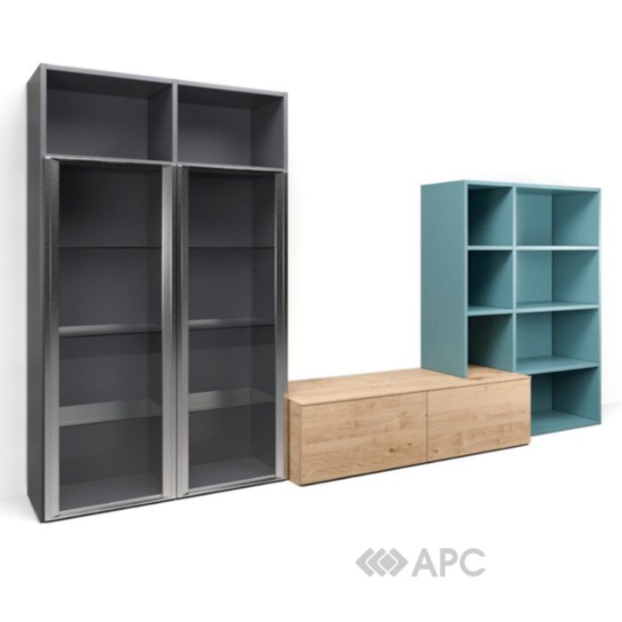 Додаткові опції: система підсвічування, скляний тонований фасад в профілі Scilm (Італія), комплектація додаткових модулів (секцій) і полиць. Можливо шпоновані елементи виробів шпоном цінних порід дерева.