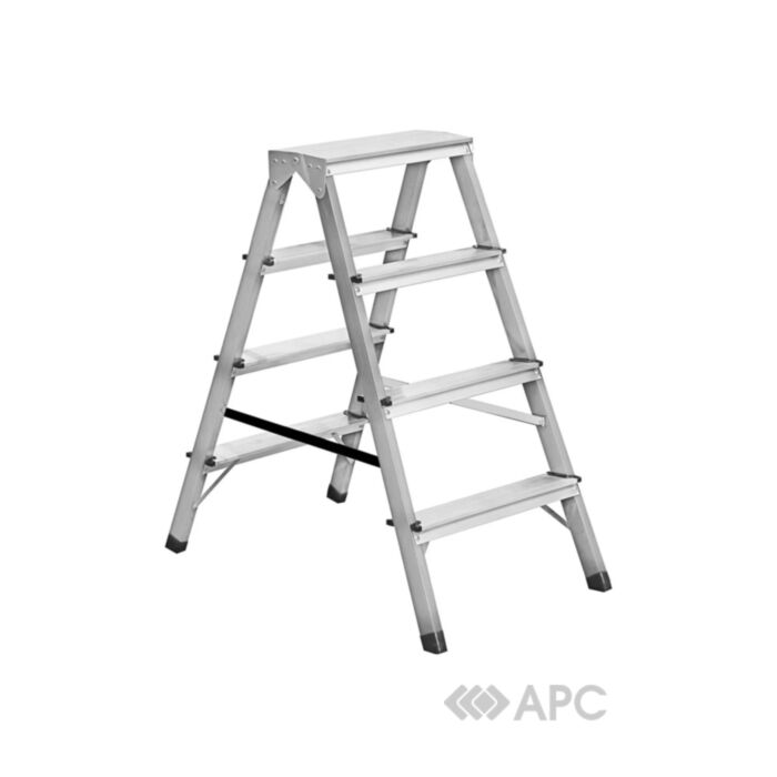 Дана модель двосторонньої стрем’янки Практика має Л-подібну форму і 4 міцні опорні ніжки з антиковзкими наконечниками, які перешкоджають пошкодження підлоги. Спеціальний профіль драбини надійно кріпиться до сходинок. Легкість і компактність драбини в зібраному вигляді гарантує її комфортне транспортування і зберігання.
