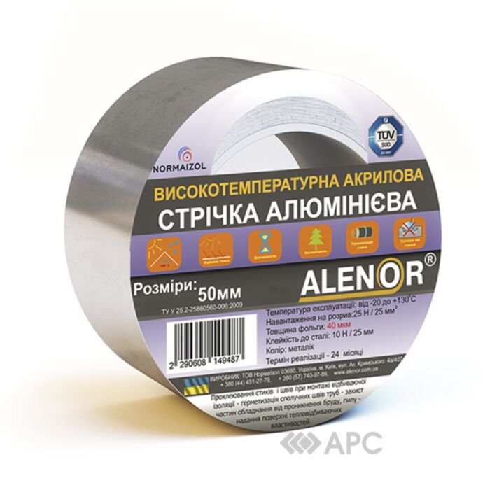 Стрічка акрилова Normaizol Alenor високотемпературна 50 мм 10 м має клейовий склад високої липкості під антиадгезійною плівкою та основу з особливої полірованої алюмінієвої фольги. Матеріал характеризується високою силою зчеплення та використовується в саунах, в організації роботи каміна або системи вентиляції та кондиціювання. З її допомогою можна легко проклеїти стики та шви у процесі монтажу відбивної теплоізоляції. Стрічка також використовується для герметизації сполучних швів труб та захисту частин обладнання від попадання бруду та пилу.