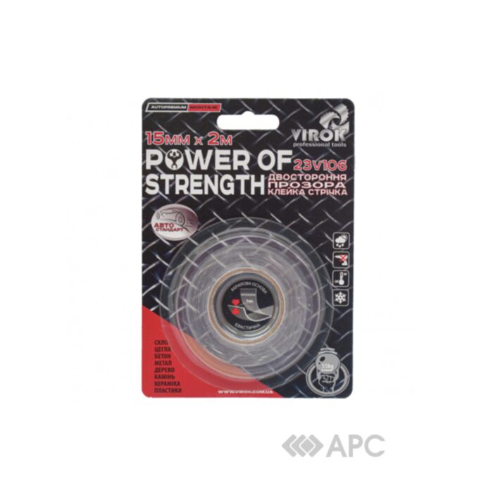 Двостороння стрічка Virok Power of strength 23V106 завдяки спіненій основі та прекрасним властивостям широко використовується в автомобільній сфері. З’єднання за допомогою даного скотчу витримує до двох-трьох років. Вологостійкість захищає матеріал від негативного впливу вологи та води, наприклад, під час миття машини на мийці. Скотч не боїться ультрафіолетових променів та дії хімікатів або дорожньої солі. Стрічка двостороння Virok стійка до навантажень та не розривається під час нанесення.