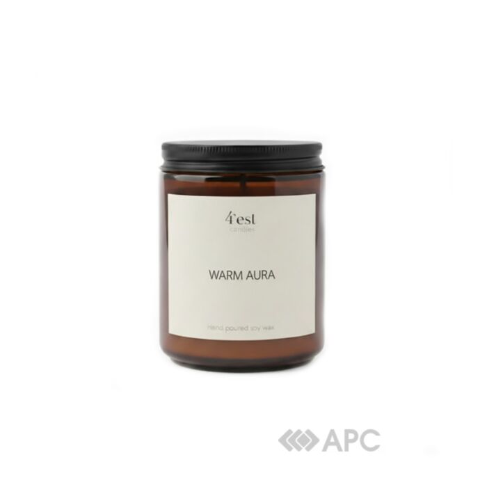 Свічка ароматична 4'est Warm Aura в склянці з кришкою 250 мл – це сучасний елемент декору, що допомагає створити атмосферу затишку та відпочинку у приміщенні. Виріб поєднує в собі стильну бурштинову баночку з металевою кришкою чорного кольору, а також соєвий віск преміум якості з дерев’яним гнітом. Чарівний аромат розкривається нотками бергамота та лаванди, вишукану базу складають кедр, перець, тютюн, а завершальні акорди заворожують теплим запахом ветиверу, мускусу, пачулі, сандалу та дерева гуаяк. Приємне потріскування деревини додає відчуття гармонії та спокою. Виробник використовує лише безпечні, натуральні, екологічні матеріали, що не шкодять навколишньому середовищу та здоров’ю людини. Тривалість горіння до 40 годин.