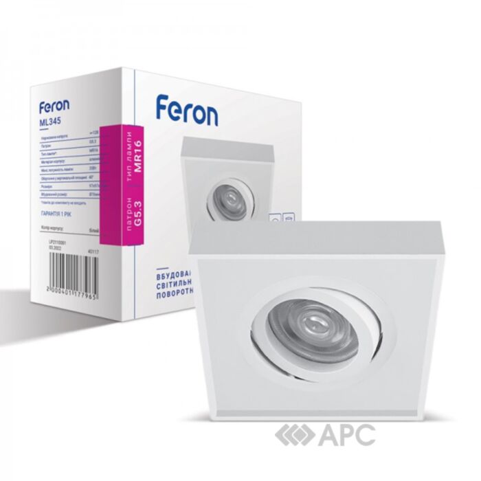 Світильник точковий Feron ML345 MR16 G5.3 квадрат білий оснащений поворотним механізмом, що дозволяє розставити світлові акценти у необхідних зонах помешкання, картинних галереях, торгових центрах та ін. Завдяки своїм конструкційним особливостям, лампа такого типу практично повністю захована. У полі зору залишається лише приємний для очей світловий потік. Світильники точкові можуть виступати не лише у якості додаткового декоративного освітлення, а й як повноцінне джерело світла. Лаконічний дизайн та чорний колір основи дозволяє встановлювати лампу у приміщеннях різних стилів.