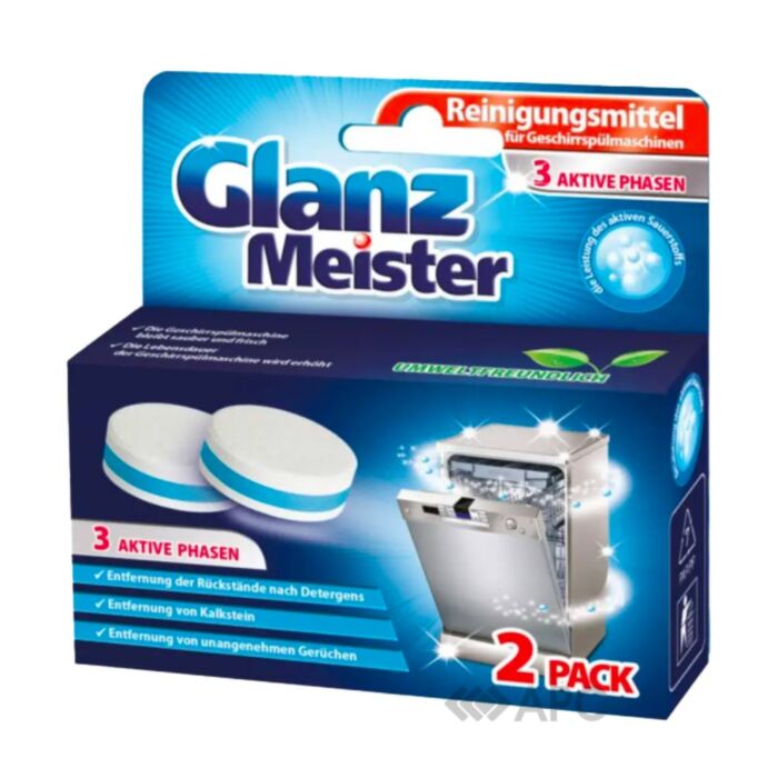 Таблетки для чищення посудомийної машини Glanz Meister - це якісний засіб, який нейтралізує запахи, видаляє накопичені жирні забруднення та накип з механічних елементів посудомийної машини, забезпечуючи їй тривалий термін служби. Кожна упаковка містить 2 таблетки, які виготовлені в Німеччині з високоякісних інгредієнтів. Склад включає від 5 до 15% відбілюючих речовин на основі кисню, до 5% аніонних ПАР, а також запашні речовини, такі як цитраль, д-лимонен, ліналоол.