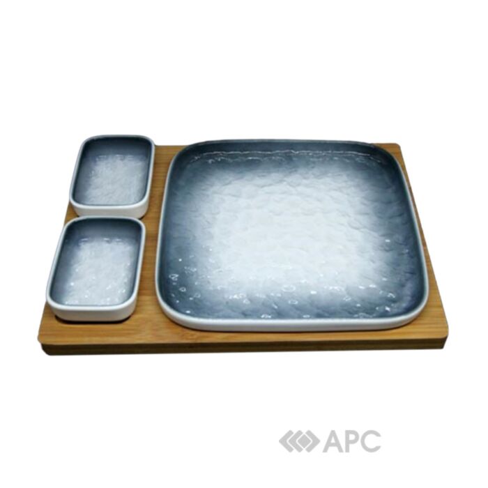 Тарілка для суші Olens Едо — це повноцінний набір, що підходить любителям китайської кухні, роблячи значно комфортнішим вживання ролів в домашніх умовах. Комплект налічує: дерев’яну підставку, два малі керамічні блюдця та одне велике, розміром 29х23 см. Вироби прямокутної форми, біло-синього кольору з асиметричним дном. Легко відмиваються від залишків їжі.