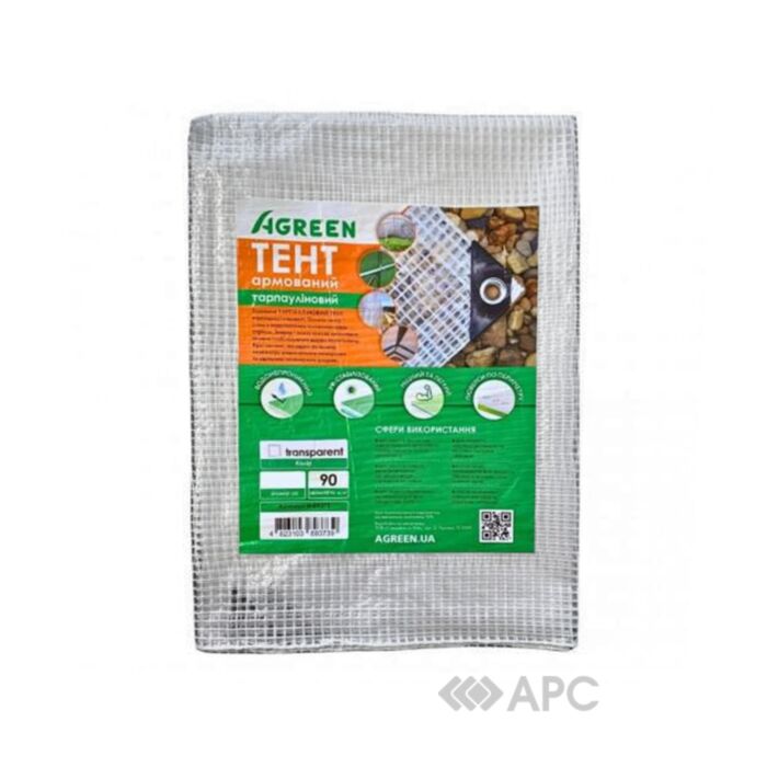 Тент універсальний Аgreen 90 г/м2 4*5 м — це високоміцний, прозорий тарпауліновий тент, армований сіткою з білих поліпропіленових стрічок, що забезпечує високу міцність на розтягнення. Краї мають подвійну товщину та оснащені алюмінієвими люверсами, а кути додатково посилені пластиковими ущільнювачами, що дозволяє легко монтувати його та з'єднувати з іншими тентами. Водонепроникний, стійкий до УФ-випромінювання та гниття. Цей міцний та легкий матеріал знаходить широке застосування: для укриття майна, захисту будівельних матеріалів від опадів, накриття зібраного врожаю, а також для облаштування тимчасових навісів.