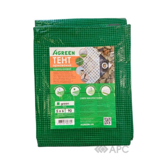 Тент універсальний Аgreen 90 г/м2 5*6 м — це високоміцний, прозорий тарпауліновий тент, армований сіткою з білих поліпропіленових стрічок, що забезпечує високу міцність на розтягнення. Краї мають подвійну товщину та оснащені алюмінієвими люверсами, а кути додатково посилені пластиковими ущільнювачами, що дозволяє легко монтувати його та з'єднувати з іншими тентами. Водонепроникний, стійкий до УФ-випромінювання та гниття. Цей міцний та легкий матеріал знаходить широке застосування: для укриття майна, захисту будівельних матеріалів від опадів, накриття зібраного врожаю, а також для облаштування тимчасових навісів.