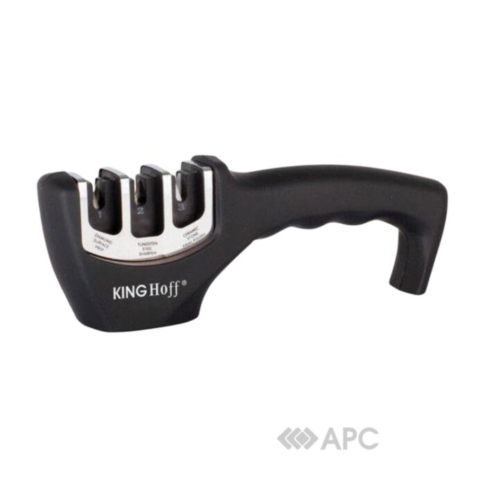 Точило KingHoff — це виріб, призначений для точіння леза ножів чи ножиць. Корпус виготовлений з твердого та якісного пластику зі стругачкою з нержавіючої сталі. Конструкція дуже проста та безпечна у використанні. На корпусі представлені три відділи заточування, комфортна, нековзна ручка. Висота виробу 50 мм, ширина 2. Польський виробник домігся високої ефективності товару шляхом ідеального відточення.