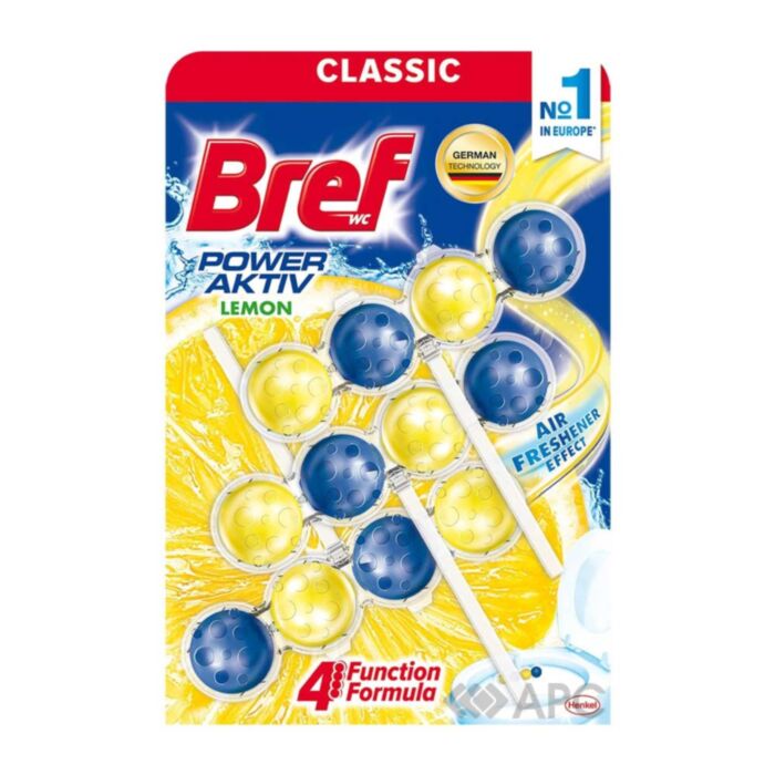 Туалетний блок Bref Сила актив Лимон 3*51 г – це надійний бар’єр від вапняного нальоту та неприємного запаху на щодень. Він розміщується на обідку унітаза та забезпечує його чистоту після кожного змивання. Кольорові кульки поєднують функції очищення та дезінфекції, залишаючи блиск і чистоту поверхні. Інноваційна формула кольорової води захищає від вапняного нальоту та інших забруднень протягом 4 тижнів. Активна піна знищує бактерії та мікроби, усуває неприємний запах. Елегантний цитрусовий аромат освіжає повітря ванної кімнати. Bref Сила актив економний у використанні та ефективний засіб для щоденної гігієни туалету.