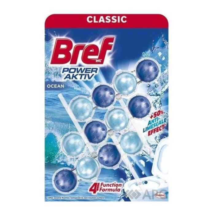 Туалетний блок Bref Сила актив Океан 3*51 г – це надійний бар’єр від вапняного нальоту та неприємного запаху на щодень. Він розміщується на обідку унітаза та забезпечує його чистоту після кожного змивання. Кольорові кульки поєднують функції очищення та дезінфекції, залишаючи блиск і чистоту поверхні. Інноваційна формула кольорової води захищає від вапняного нальоту та інших забруднень протягом 4 тижнів. Активна піна знищує бактерії та мікроби, усуває неприємний запах. Елегантний морський аромат освіжає повітря ванної кімнати. Bref Сила актив економний у використанні та ефективний засіб для щоденної гігієни туалету.