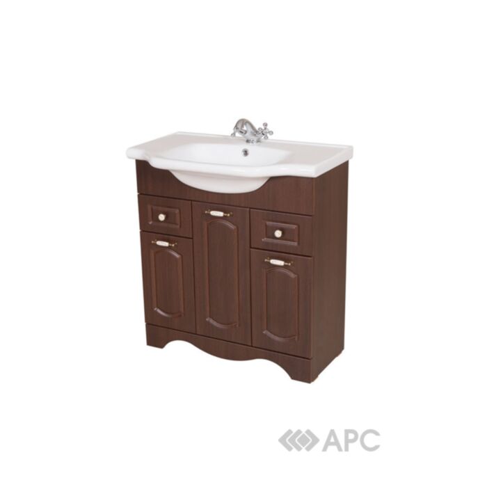 АКВА РОДОС Класік 80 італійський горіх виконаний у вишуканому та легкому стилі Ар Деко. Злегка округлені краї тумб доповнюються плавними вигинами декорів філенчатних дверей.