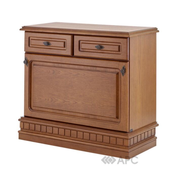 Завдяки своїй формі тумба для взуття Наполеон чудово розташується у передпокої чи на веранді Вашого будинку. Окрім відділення на взуття, виріб має дві висувні шухляди.