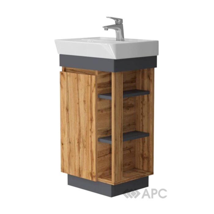 Дедалі частіше зустрічаються моделі меблів для ванної кімнаті виконані в кольорах максимально наближених до дерева. Однією із таких є підлогова тумба Ювента Utah з умивальником Neon 45 см. Такий елемент інтер’єру не втратить своєї актуальності, радуватиме око не лише господарів, а й гостей. Два місткі відділи із полицями без проблем вмістять усі потрібні речі. Для виготовлення використовують ДСП товщиною 16 мм. Надійна фурнітура забезпечує комфортне та безшумне користування. Дана тумба комплектується керамічним умивальником Neon 45 см.