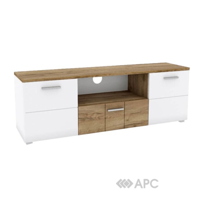 Тумба під телевізор Candy A - частина модульної системи, виробництва торгової марки Blonski. З колекцією Candy гра кольорів і простих форм дозволяє створити унікальні інтер'єри сучасної вітальні. Мінімалістичний стиль меблів витриманий в кольорах фасадів Дуб Крафт табако / Білий мат. Характер меблів підкреслює проста форма металевих ручок на тлі заокруглених фасадів, виготовлених з МДФ 22 мм і обклеєні плівкою ПВХ.
