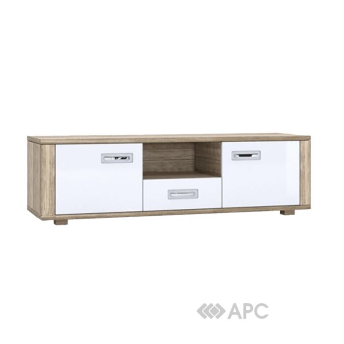 Проста, лаконічна конструкція, виготовлена з ДСП, є зручним місцем для розміщення аудіо- та відеоапаратур. Дві розпашені ніші легко відкріваються з допомогою металічніх ручок, стануть в нагоді для зберігання аксесуарів.