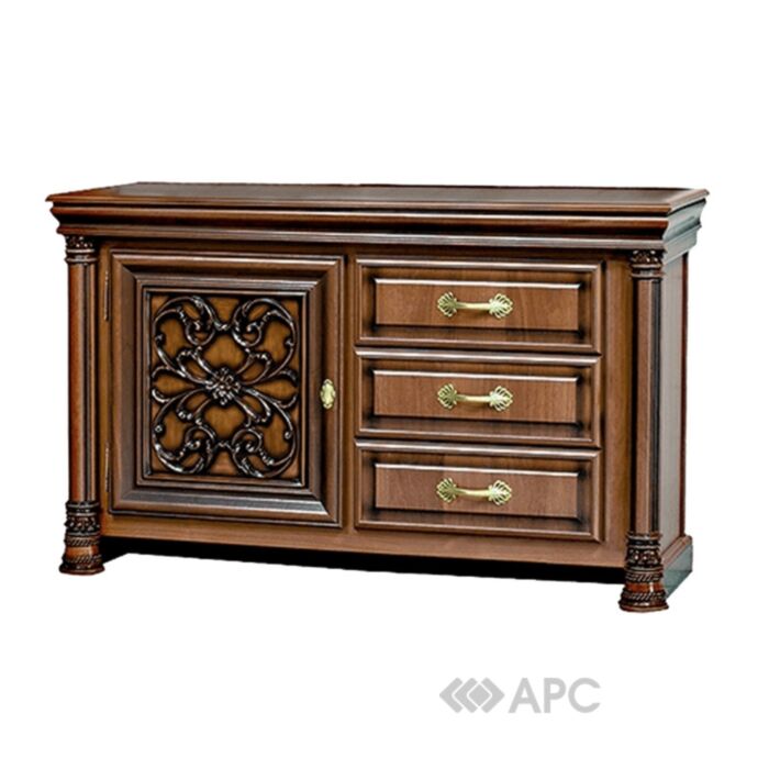 Тумба під телевізор Гранда варіант 1 оснащена трьома висувними ящиками та шухлядами з унікальними різьбленими візерунками на дверцятах. Елегантні ручки чудово гармонують з загальним меблевим ансамблем. Тумба може бути виконана в різних кольорах. Виріб входить до складу модульної системи Гранда, яка виконана у цікавому неокласичному стилі. Тумба під телевізор - красивий та функціональний меблевий елемент чудово виглядає в інтер'єрі вітальні, спальні чи просторого коридору.