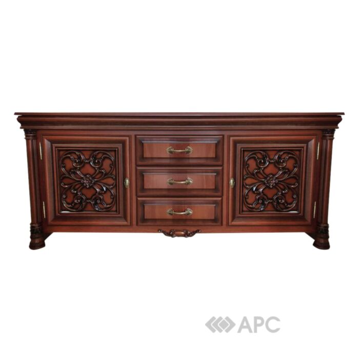 Тумба під телевізор Гранда варіант 2 оснащена трьома висувними ящиками та шухлядами з унікальними різьбленими візерунками на дверцятах. Елегантні ручки чудово гармонують з загальним меблевим ансамблем. Тумба може бути виконана в різних кольорах. Виріб входить до складу модульної системи Гранда, яка виконана у цікавому неокласичному стилі. Тумба під телевізор - красивий та функціональний меблевий елемент чудово виглядає в інтер'єрі вітальні, спальні чи просторого коридору.