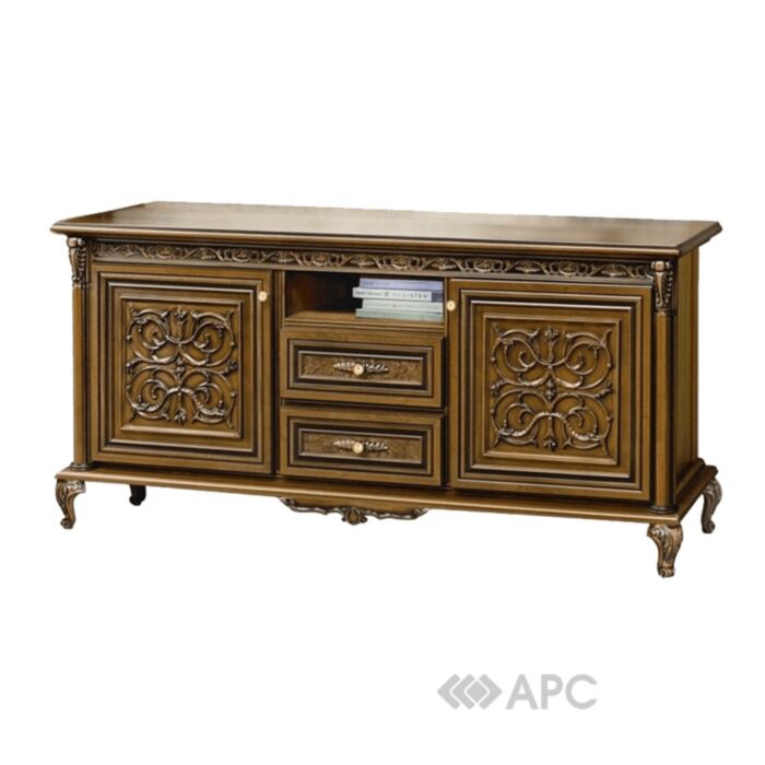 Комод під телевізор стоїть на фігурних ніжках, прикрашений витонченими декоративними елементами та унікальним різьбленням. Меблевий виріб входить до складу модульної системи Тоскана Лукка, яка виконана в розкішному неокласичному стилі.