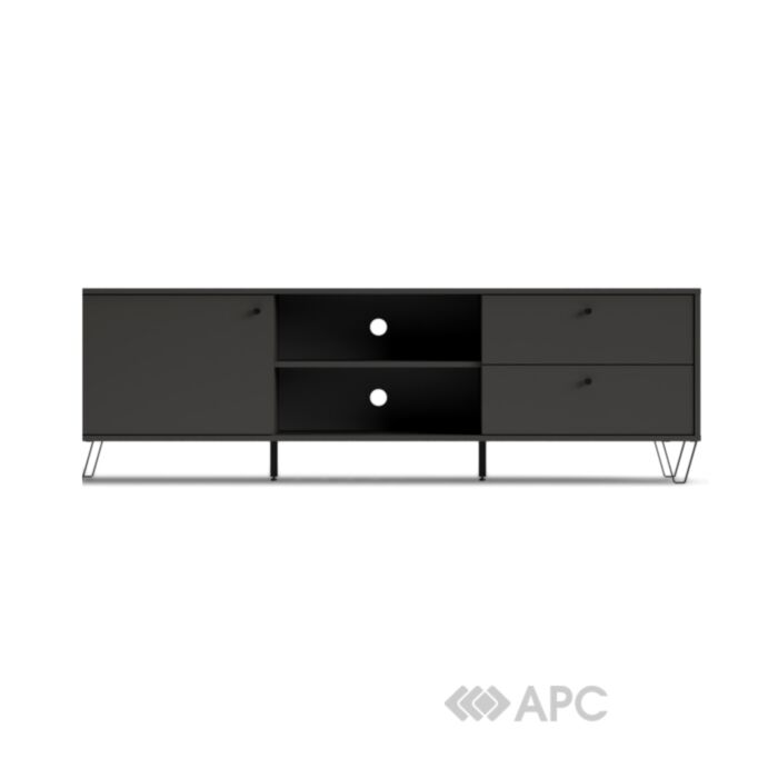 Тумба під ТВ GF Aldo AL1 базальт - це елегантне та функціональне рішення для телевізора у сучасному стилі. Виготовлена з міцної ДСП плити з відповідною маркуванням якості FSC, вона гарантує надійність та тривалість використання. Оснащена дверцятами з відсіком для зручного зберігання різних предметів. З правого боку розташовані два зручні ящики, які надають додатковий простір. У центрі тумби розміщені два відкриті відділення, де можна розмістити декоративні елементи або мультимедійне обладнання. За відкритими відсіками передбачено поглиблення для підключення обладнання, що забезпечує зручність та естетичний вигляд.