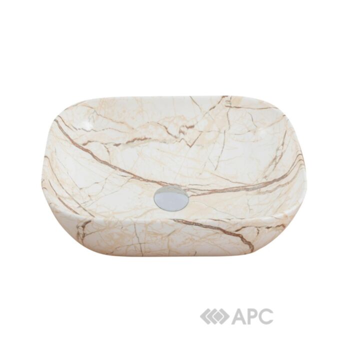 Умивальник Cabo Calypso Marble Beige Gloss 45,5*32,5*13,5 см – це накладна модель, призначена для встановлення на стільницю, що вирізняється своїм унікальним дизайном імітації мармуру. Він має овальну форму з чіткими лініями, а його глянцеве покриття в кольорі бежевого мармуру надає виробу вишуканого та теплого вигляду. Умивальник виготовлений з кераміки, що забезпечує його довговічність, високу гігієнічність та стійкість до повсякденного використання.