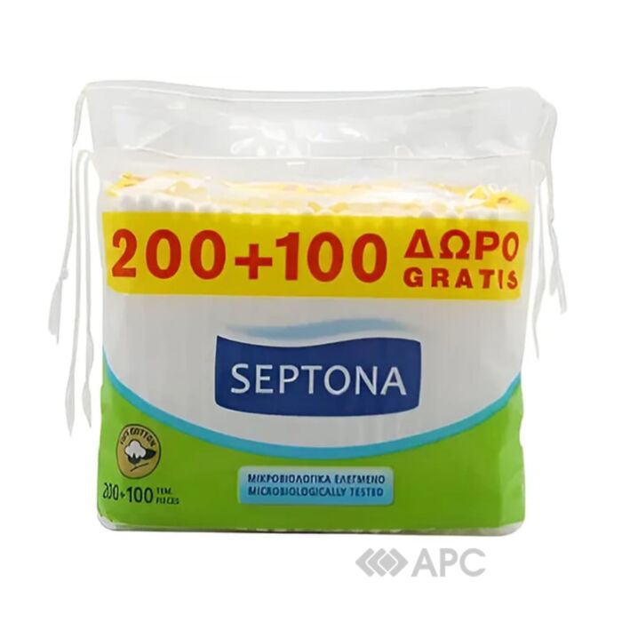 Ватні палички Septona 200+100 шт використовуються для ретельного та делікатного очищення вушних раковин. Вони виготовлені з високоякісної бавовни, м’які, гіпоалергенні, безпечні за умови дотримання рекомендацій щодо застосування. Бавовняна голівка міцно закріплена на пластиковому аплікаторі. Продукція в зручному пакуванні надійно захищена від потрапляння пилу та будь-яких інших зовнішніх факторів, що забезпечує високу гігієнічність.