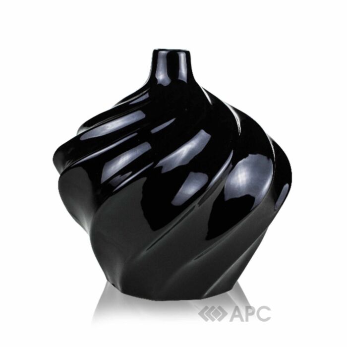 Ваза має невеликий розмір і висоту 22 см. За формою вона нагадує старовинну пляшку з вигнутими плавними лініями. Буде прекрасним доповненням в якості окремого елемента і в композиції з красивим букетом. Виріб виконаний в чорному кольорі, що вимагає особливого підходу в процесі створення інтер'єру.