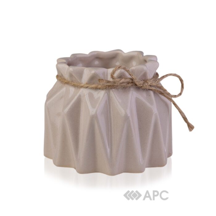Керамічна ваза Eterna поєднує в собі оригінальність з максимальною практичністю. Її форма - це екзотичний маленький мішечок тубільця з ребристою поверхнею, перетягнутий зверху на широкій горловині крафтовою мотузкою. Колір, форма і фактура роблять її універсальною для будь-якого інтер'єру.