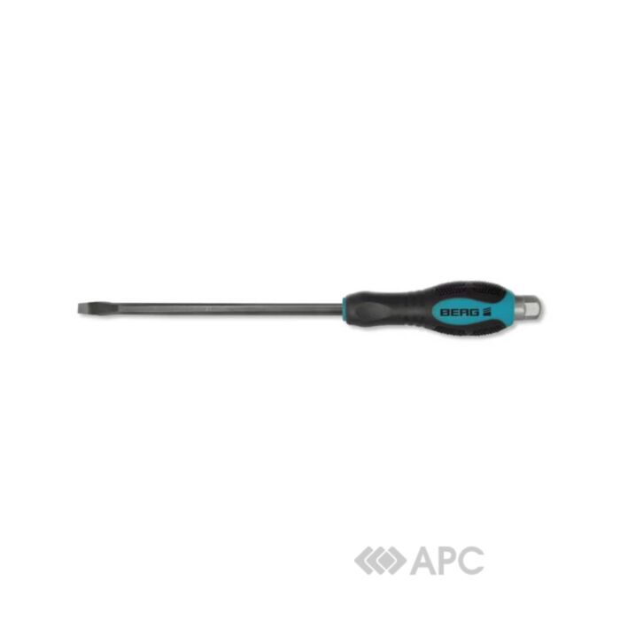 Викрутка плоска ударна Berg 46-230 виготовлена з високоякісної сталі S2. Має антикорозійне покриття з нікелю. Форма і розмір шліца: SL5 (плоский). Хвостовик виконаний під гайковий ключ 11 мм, що дозволяє використовувати при необхідності додатковий важіль. Кінчик викрутки намагнічений. Прекрасно підходить для роботи, що вимагає значних зусиль.