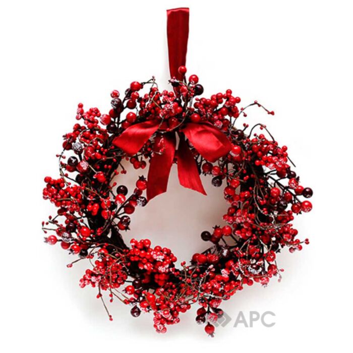 Вінок декоративний з ягодами і бантом 758-223 можна почепити, як на вхідні двері, так і поставити на стіл або ж журнальний столик, витончено прикрасивши декороативними стилізованими підсвічниками, квіткою Пуасенсії, новорічними іграшками та застеливши різдвяну скатертину.