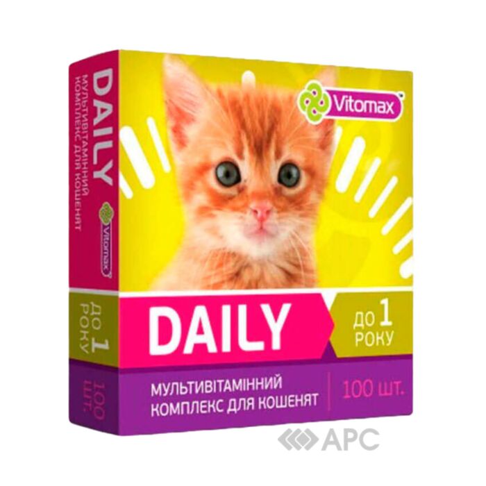 Вітаміни Vitomax Daily для кошенят - це спеціально розроблений комплекс, який допомагає забезпечити здоровий і повноцінний розвиток вашого улюбленця з самого народження. Завдяки вітамінам і мінералам у складі, вони формують скелет і зуби кошеняти, сприяють швидкому розвитку і нарощуванню м'язової маси. Крім того, комплект підвищує імунітет тварини, нормалізує роботу шлунково-кишкового тракту і забезпечує життєво-важливі обмінні процеси в організмі. Також допомагають у профілактиці вітамінно-мінеральної недостатності. Склад охоплює молоко сухе знежирене, пивні дріжджі, кальцій, фосфор, біотин, глюкозу, ячмінно-солодовий екстракт, стеарат кальцію, вітаміни групи В, А, С, DL-метіонін. Рекомендована доза - 2 таблетки в день, але для ослаблених тварин треба подвоїти.
