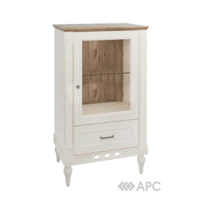 Вітрина мала FL-W/M з прозорим склом, модульною системою FLORENCJA TARANKO. Виробництво: фабрика Taranko (Польща). Випускається в кольорі: дуб флоренция / ваніль. Використовувані матеріали: корпус - МДФ, ламінована шпоном вільхи; фасад - МДФ, ламінована шпоном вишні; рамковий фасад - масив вільхи; ніжки - масив бука.