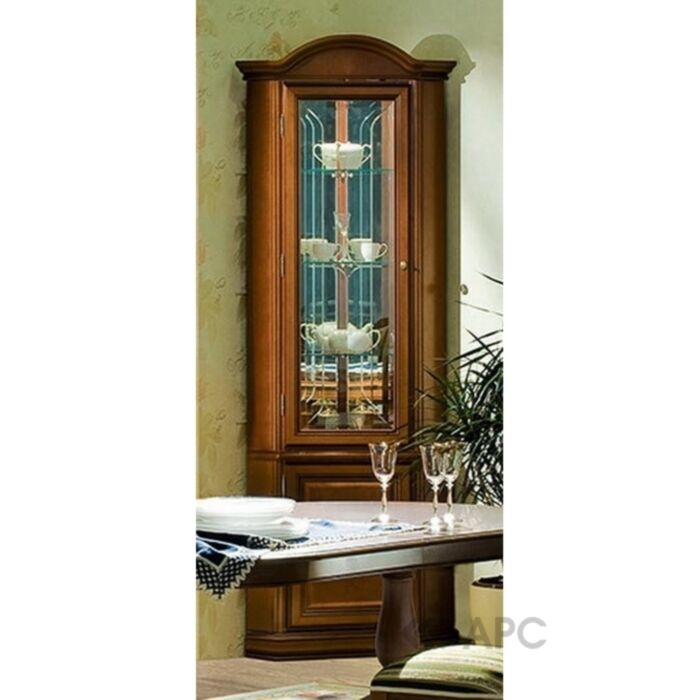 Елегантна кутова шафа - вітрина виконана в благородному класичному стилі. Прозорі дверцята і скляні полки надають шафі легкість, витонченість. Завдяки дзеркальній задній стінці і галогенним світильникам те, що Ви поставите всередину шафи, буде виглядати дуже ефектно.