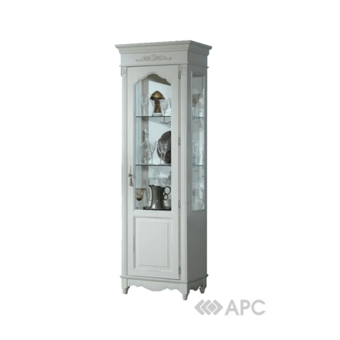 Витончена шафа - вітрина виконана в стилі Прованс. Меблі Рів'єра грають не тільки функціональну роль, вони створюють у Вашому будинку затишок і умиротворення французької провінції, приносить розкіш і витонченість блакитного берега, знаменитої Рів'єри. Витончений вигляд надають цьому шафі дверцята зі склом і скляні полки, декоративний карниз і різьблені елементи.