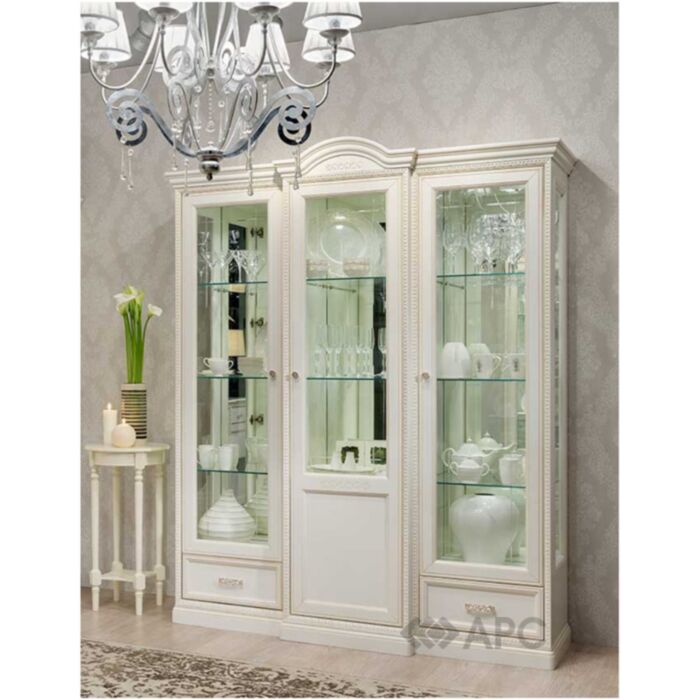 Елегантна шафа - вітрина виконана в благородному класичному стилі. Прозорі дверцята і бічні панелі, скляні полки надають шафі легкість, витонченість. Завдяки дзеркальній задній стінці і галогенних світильників те, що Ви поставите всередину шафи, буде виглядати дуже ефектно.