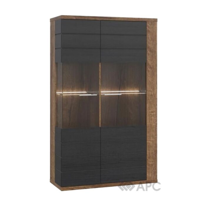 Вітрина Lacjum LCJV521R часть модульної системи FORTE виготовлена в Польщі. Колекція Alexandria - це розкіш в поєднанні з класичним дизайном і сучасною функціональністю. Виготовляється з ДСП, рамковий фасад - МДФ. Дизайнери використали тут вдале поєднання кольору і фактури: текстури натуральної деревини благородного і чорного дуба і скла, яке візуально полегшує модель і відкриває погляду скляні полиці з декором або посудом.