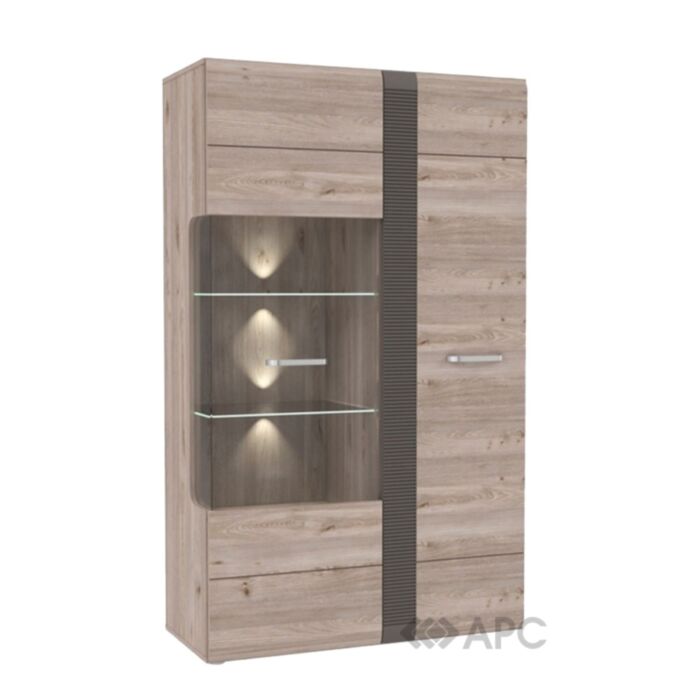 Вітрина права Locarno LCRV521R - частна модульної системи FORTE, виготовленої в Польщі. Locarno - стильна колекція, яка приваблює увагу цікавими дизайнерськими рішеннями. Корпус виготовляється з ДСП, фасад - МДФ. Світлий відтінок «дуб нельсон» оригінально скомбінований з контрастними рельєфними вставками сірого кольору. Відмінною особливістю колекції є хромовані ручки незвичайної форми і плавно закруглені зверху і знизу фасади. Вітрини з прозорим склом додатково комплектуються підсвічуванням. Широкий асортимент меблів Locarno Forte дозволяє обладнати затишну вітальню.