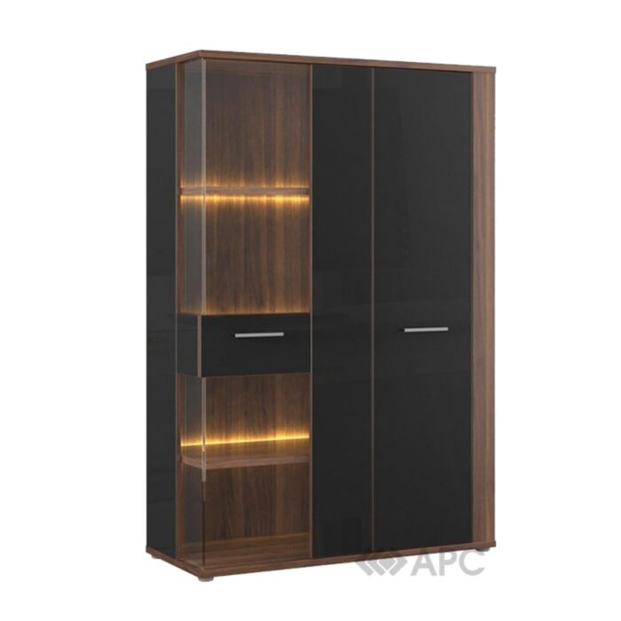 Вітрина права LOMBARDO LBDV621R з колекції LOMBARDO, привертає увагу своїм ефектним і оригінальним дизайном, який поєднує в собі класичний і сучасний стилі одночасно. Виготовляється з ДСП в цікавої комбінації кольорів: "горіх колумбія / чорний глянець". Практично в усі модулі за бажанням можна додатково встановити підсвічування, що створює особливий інтригуючий характер меблів LOMBARDO. Вітрина містить два закритих відділення з трьома полицями всередині кожного. Ліві двері оснащені прозорим склом. Додатково вітрина комплектується підсвічуванням.