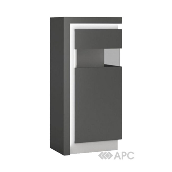 Вітрина Lyon LYOV02L від польської фабрики Wójcik (Войчик). Складається з одних частково засклених дверей. В середині три полички. Окремо можна докупити підсвічування двох типів: внутрішню для підсвічування вітрин, і зовнішню для декору.