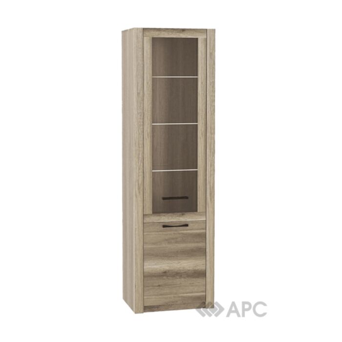Вітрина права Maximus MDXV53R від польської фабрики Forte - стильна колекція модерністичних форм з незвичайними хвилеподібними ручками на фасадах і масивними рамами. Виготовляється з ДСП в кольорі «дуб античний» під старовину.
