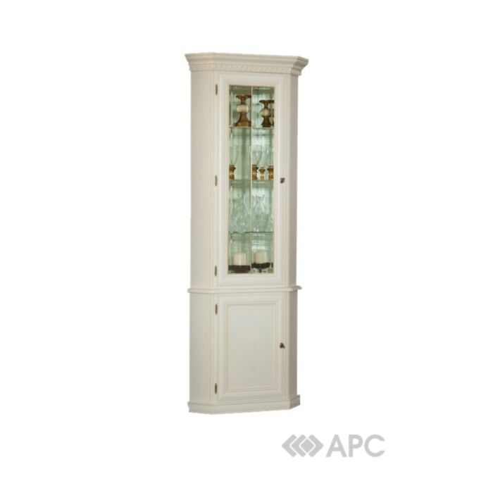 Елегантна кутова шафа - вітрина виконана в класичному стилі. Прозорі дверцята і скляні полки надають шафі легкість, витонченість. Завдяки дзеркальній задній стінці і галогенним світильникам те, що Ви поставите всередину шафи, буде виглядати дуже ефектно.