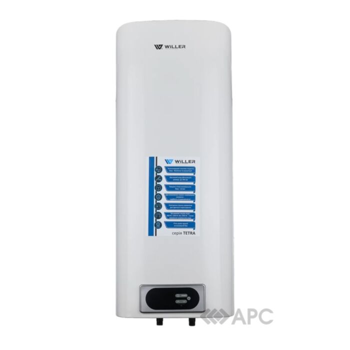 Водонагрівач вертикальний Willer Tetra EV50DRI — це надійний накопичувальний бойлер з об'ємом 50 літрів, призначений для побутового використання у квартирах, будинках та на дачі. Він оснащений мідним сухим нагрівальним елементом потужністю 2,0 кВт, що забезпечує ефективний нагрів води з мінімальним енергоспоживанням. Внутрішній бак покритий титанокварцевою емаллю та має магнієвий анод від корозії та продовження терміну служби.