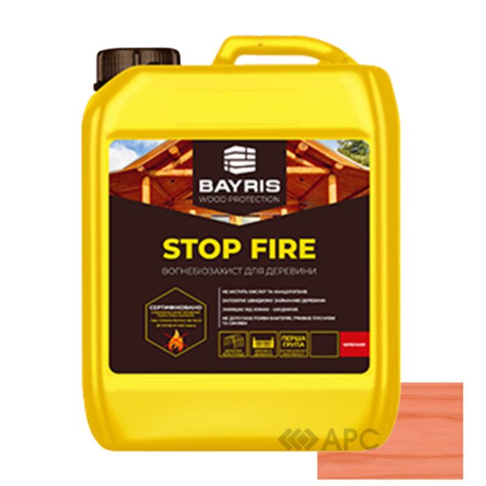 Вогнебіозахист для дерева Bayris Stop Fire червоний 10 л з маркувальним пігментом застосовується для комплексного захисту конструкційних дерев’яних елементів (горищних покриттів, каркасів, зрубів, кроквяних систем, несучих конструкцій дерев’яних будинків, балок тощо) та іншої будівельної деревини від вогню та біологічних уражень. Використовується для усіх порід деревини, що не мають прямого контакту з водою та не піддаються атмосферним впливам в умовах класів використання. Препарат без запаху, помірно стійкий до вимивання, червоного відтінку. Підходить для побутового, промислового та професійного використання.