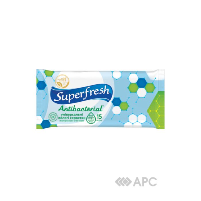 Вологі серветки SuperFresh — це продукція, яка призначена для очищення шкіри рук та тіла. Особлива антибактеріальна формула, забезпечує дбайливе очищення, зволоження, запобігає пересушуванню шкіри, усуває бактерії, не викликає подразнення. Виготовлені із якісного нетканого полотна, мають нейтральний рівень pH, без спирту. Пакування містить 15 штук, що надійно заклеюються наліпкою.