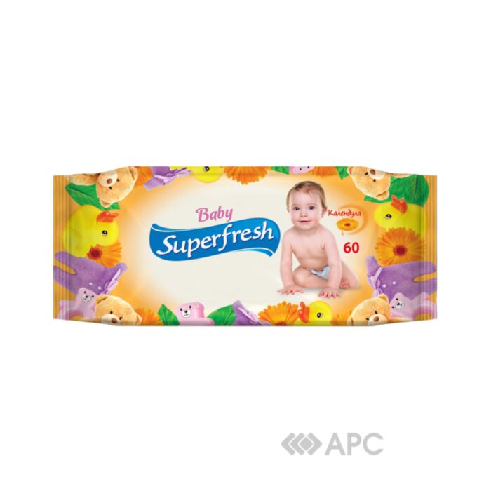 Вологі серветки SuperFresh — це продукція, що призначена для очищення шкіри малюків та їхніх мам. Особлива формула з екстрактом календули, яка входить до складу, забезпечує дбайливе очищення, зволоження та догляд. Вони не пересушують шкіру, усувають бактерії, запобігають подразненню, просто необхідні при заміні підгузків. Виготовлені із якісного, безпечного нетканого полотна. В упакуванні міститься 60 штук, розміром 15х19 см.